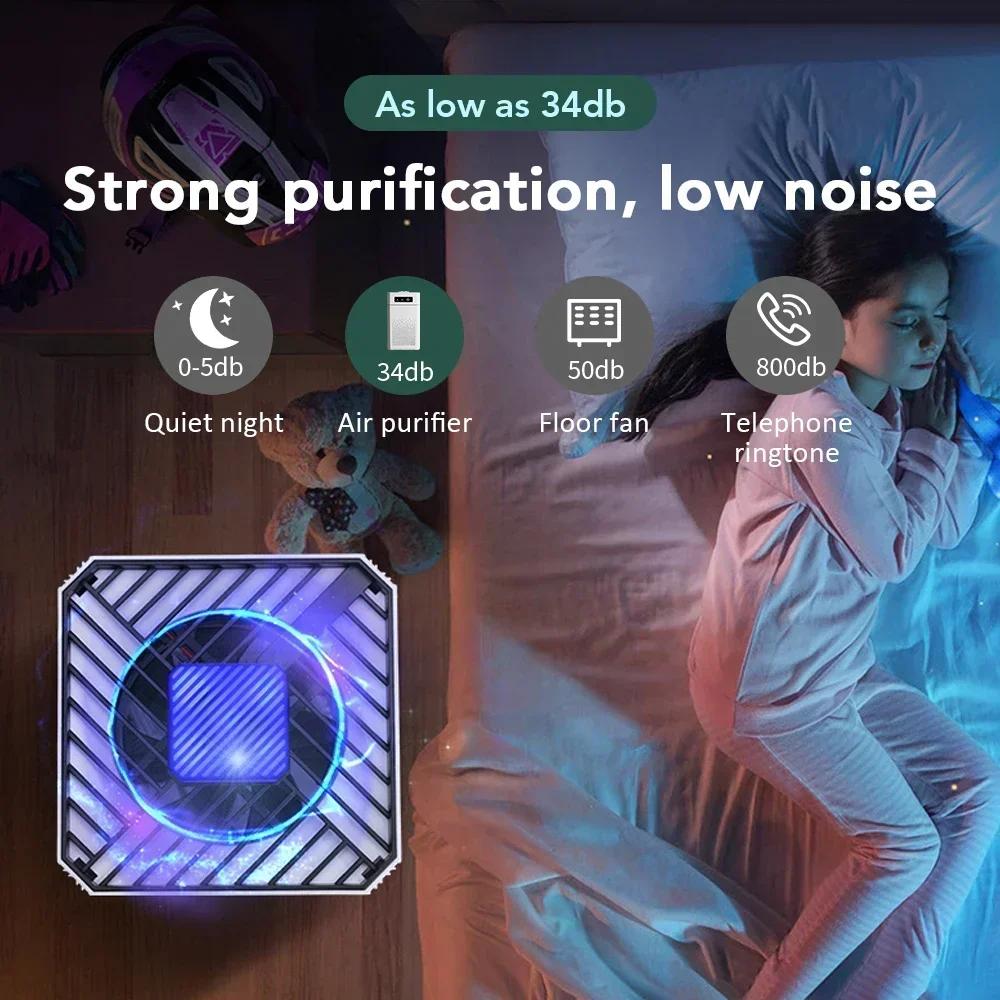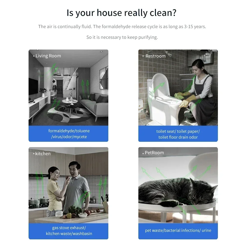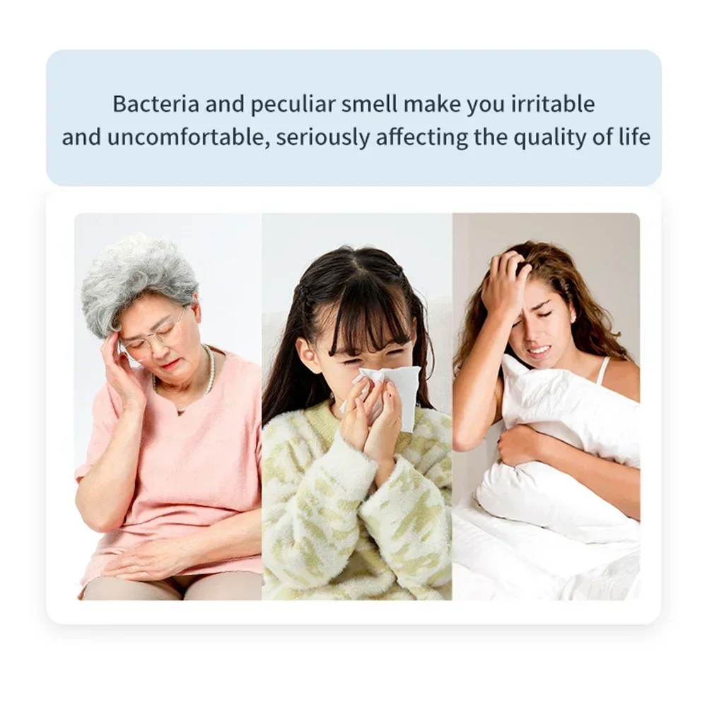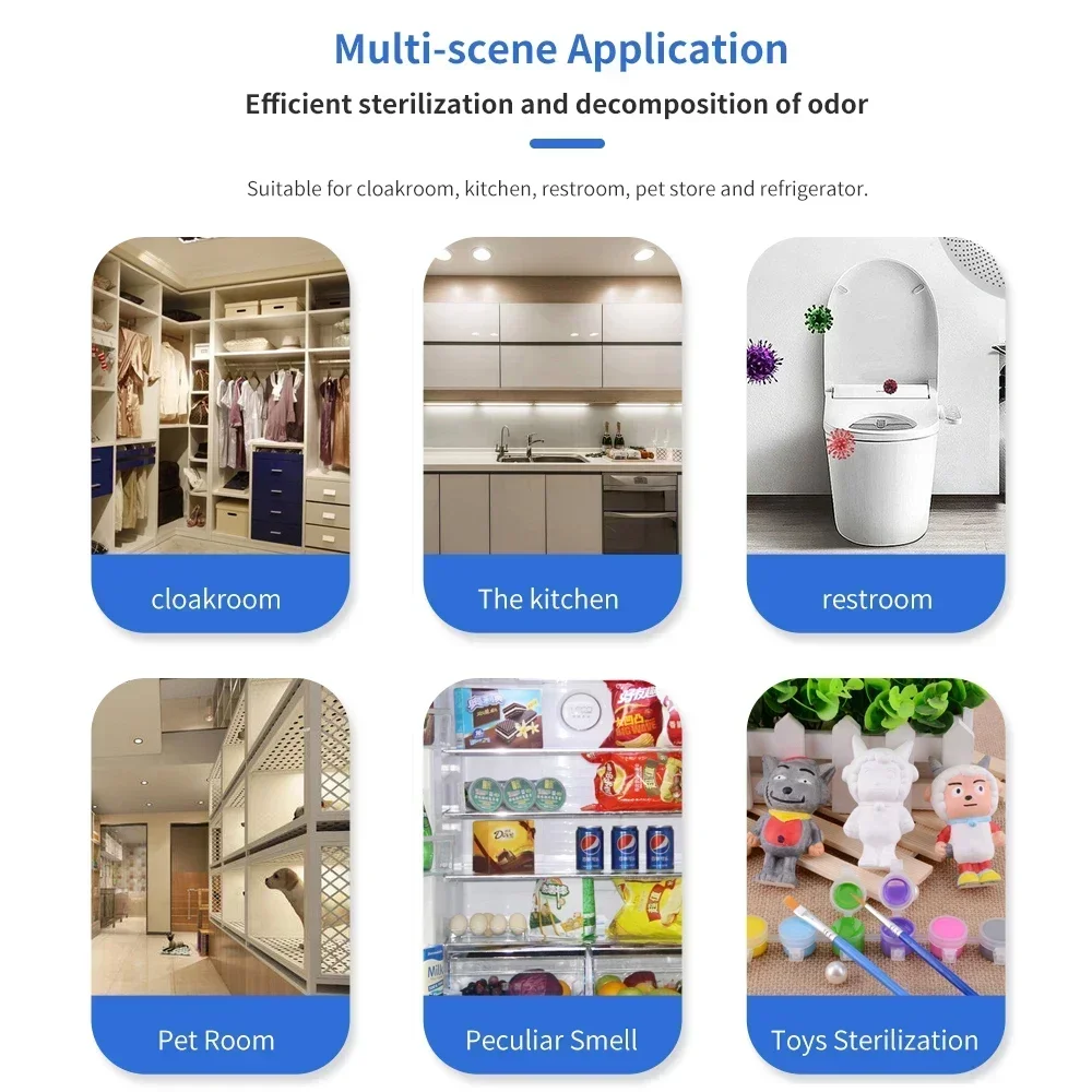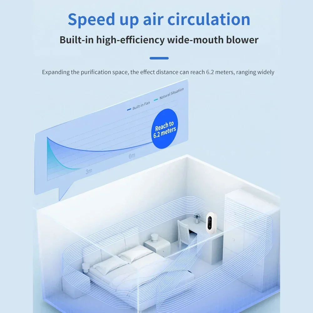 This smart air purifier uses ozone and negative ions to sterilize, deodorize, and purify indoor air. It effectively removes odors, formaldehyde, and harmful bacteria—ideal for kitchens, toilets, pet areas, and small rooms. Its compact, portable design fits any space.