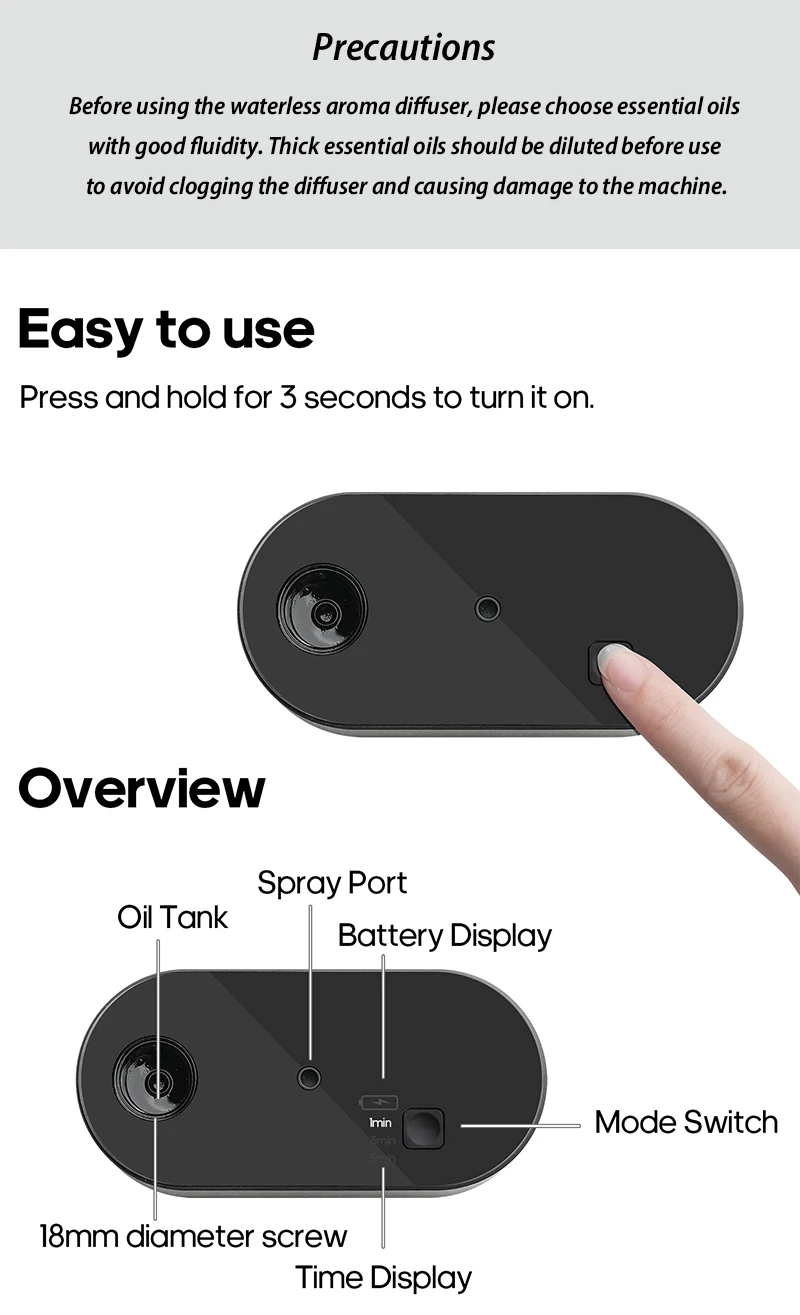 Enjoy premium aromatherapy anywhere with this compact waterless diffuser by KINSCOTER. Designed for 10ml or 20ml oil bottles, it features adjustable intensity with 3 spray modes, a long-lasting 2000mAh battery, and a stylish, giftable design made from BPA-free material.